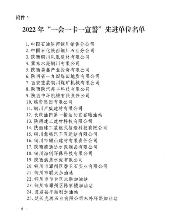 根據(jù)銅安委辦發(fā)〔2023〕3 號文件通報,陜建裝配智造公司榮獲銅川市 2022 年度“一會一卡一宣誓”先進單位表彰。
