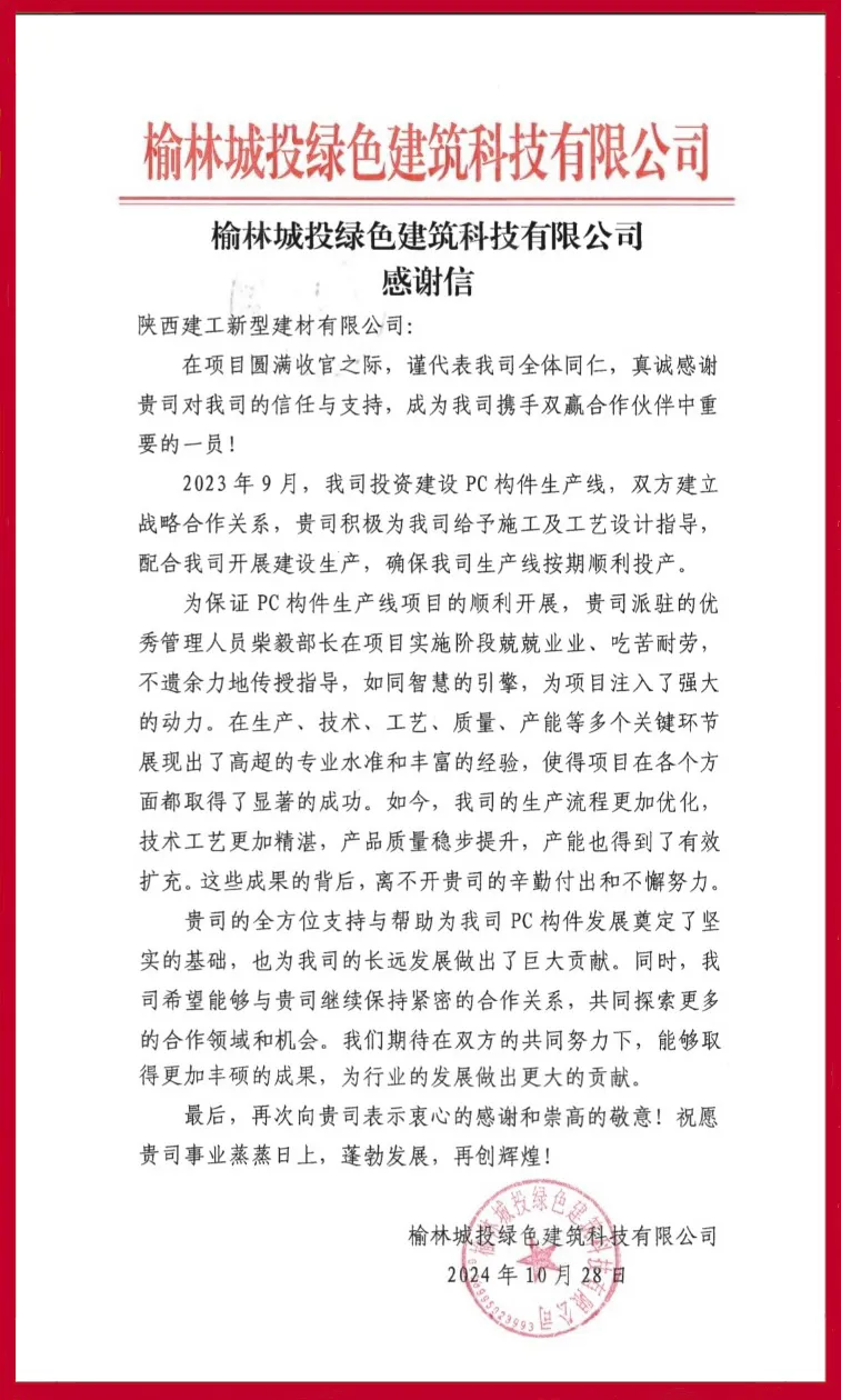 柴毅有多崗位工作經(jīng)歷,派駐過(guò)程中為合作伙伴在生產(chǎn)流程、技術(shù)工藝、產(chǎn)品質(zhì)量和產(chǎn)能提升等方面不遺余力地傳授指導(dǎo)。他的辛勤付出和不懈努力,不僅贏得了合作伙伴的高度贊譽(yù),更為我司贏得了良好的業(yè)界口碑。為此,榆林城投綠色建筑科技有限公司特向我司發(fā)來(lái)感謝信,并贈(zèng)送寫(xiě)有“精誠(chéng)合作,攻堅(jiān)克難”的錦旗,以表達(dá)對(duì)我司及柴毅的深深謝意。