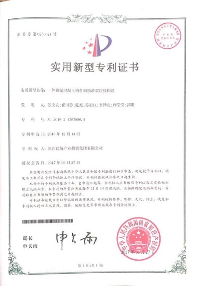 近日,由集團公司申請的實用新型專利《一種預制混凝土構件鋼筋灌漿連接構造》,經(jīng)中華人民共和國國家知識產(chǎn)權局嚴格審查,已順利通過并喜獲授權。