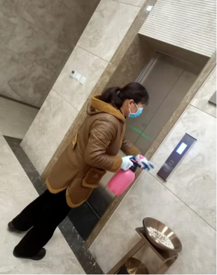 新型建材工作人員正在對辦公樓側(cè)門、電梯按鍵進(jìn)行消毒
